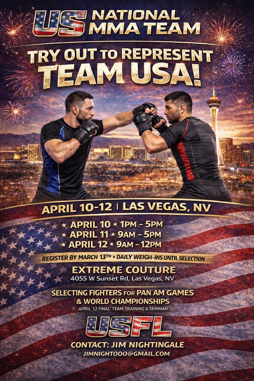 US Junior/Senior National MMA Team Tryout April 10 - April 13 Xtreme Couture MMA 4055 W Sunset Rd, Las Vegas,, United States Register by March 13th.